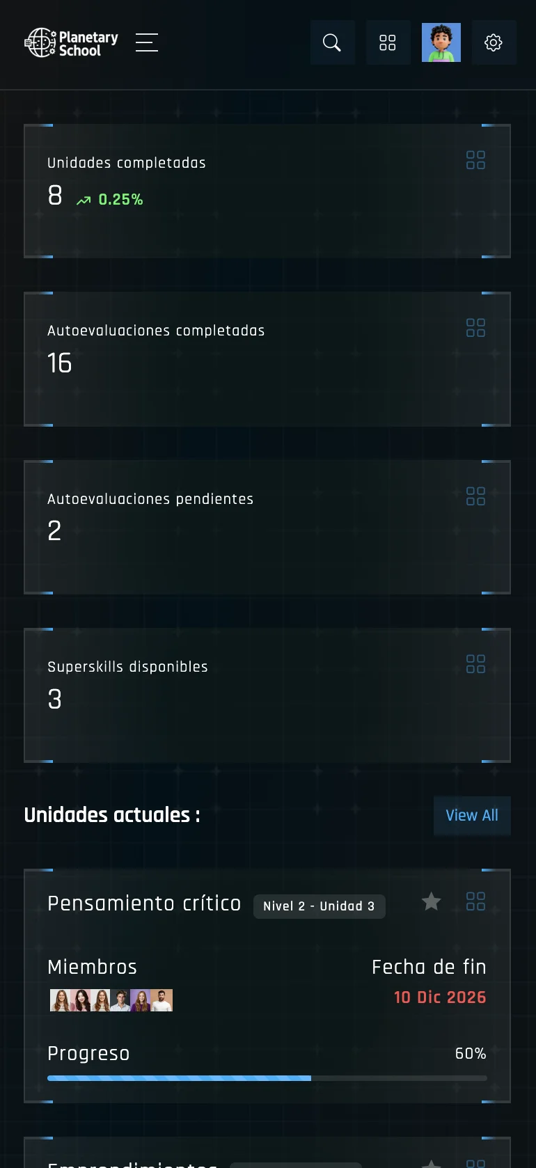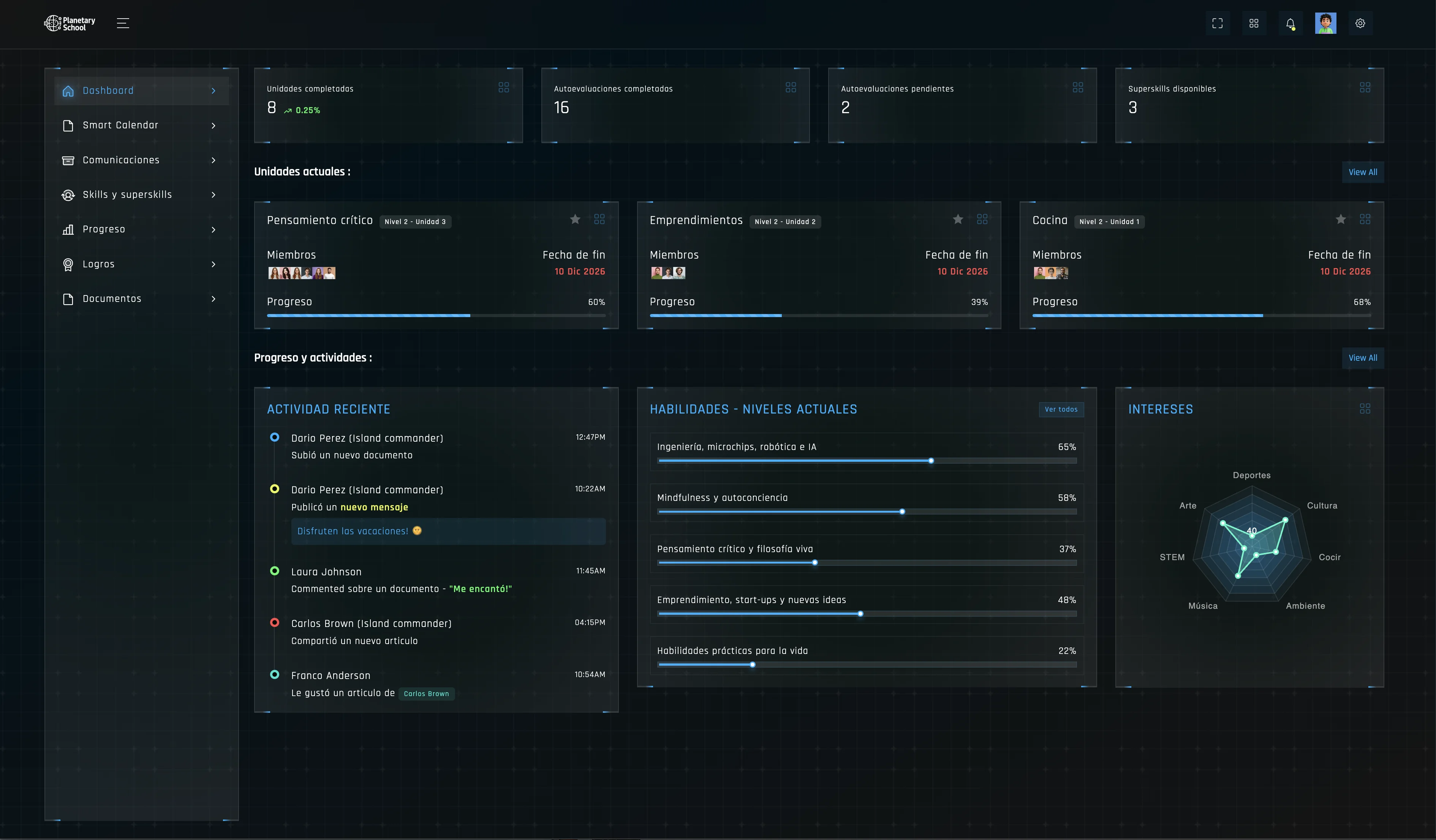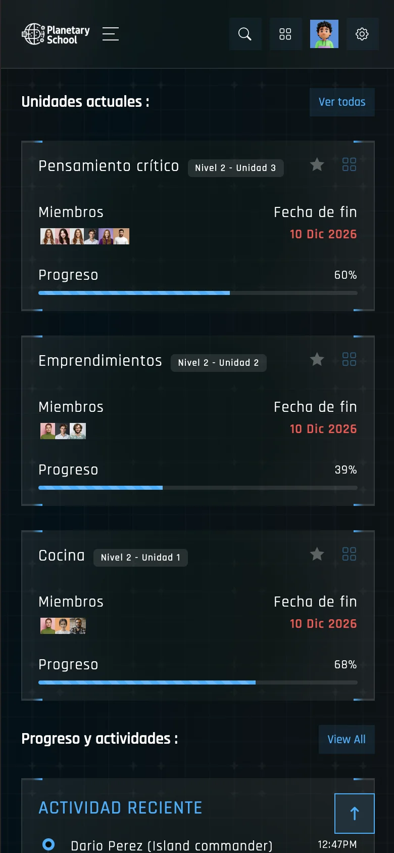 La plataforma tecnológica de Planetary School es una herramienta integral diseñada para personalizar, organizar y potenciar el proceso de aprendizaje de cada estudiante. Aunque el enfoque principal es la educación presencial y las interacciones reales, la plataforma juega un papel esencial en la coordinación y optimización de todas las actividades educativas. La plataforma ofrece un interfaz intuitiva y fácil de usar. La plataforma está diseñada para estudiantes, educadores y padres, con un diseño simple y directo. Con un diseño claro y navegación sencilla, el sistema es accesible y agradable para todas las edades.